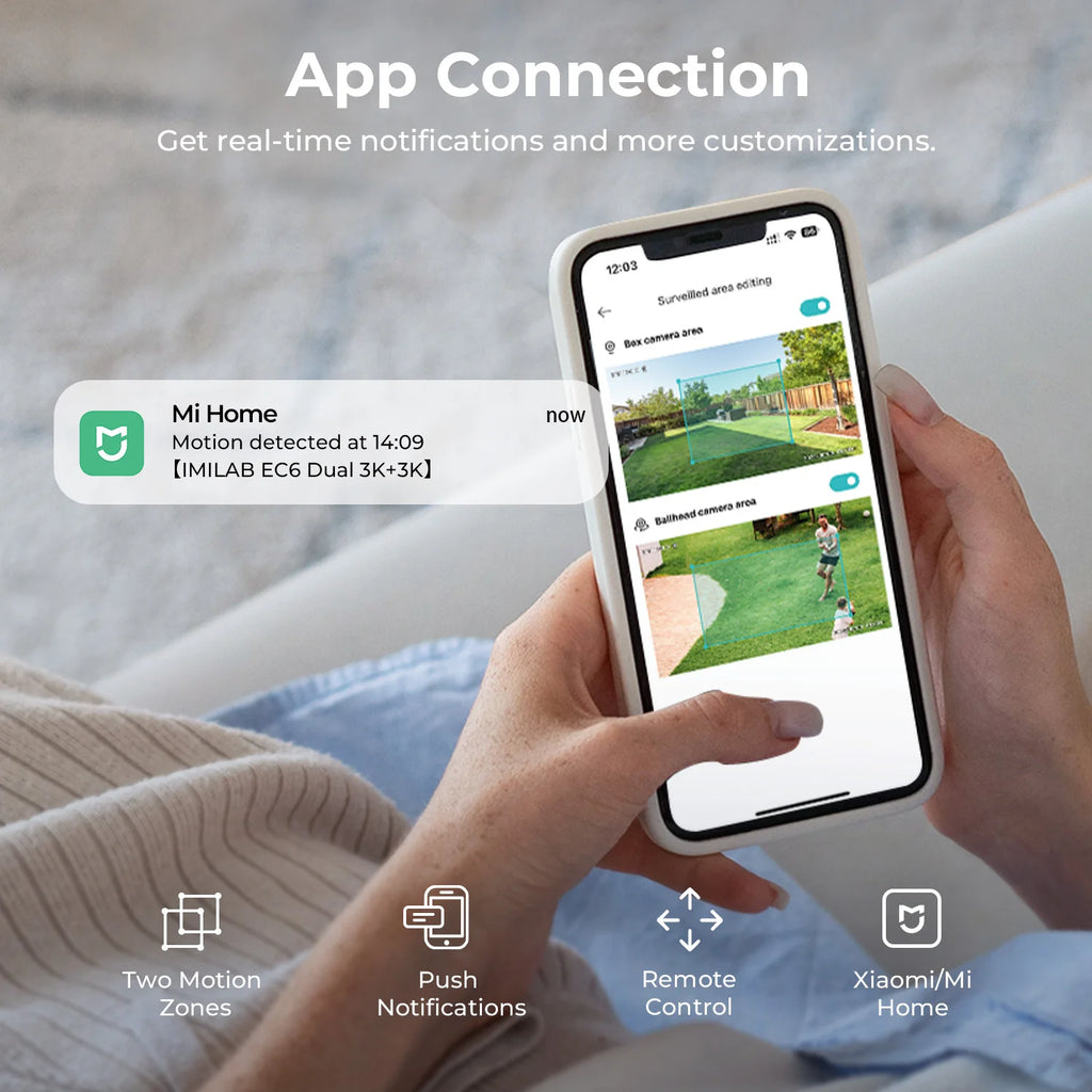 The EC6 Dual WiFi Outdoor Camera offers a comprehensive 360° field of view for seamless monitoring around your home, thanks to its dual 2K lenses. With intelligent AI-powered human and vehicle detection, it reduces false alarms and reliably notifies you of movement from people, cars, or bicycles. The camera is compatible with the Mi Home app, enabling easy control and remote access via smartphone – whether iOS or Android.