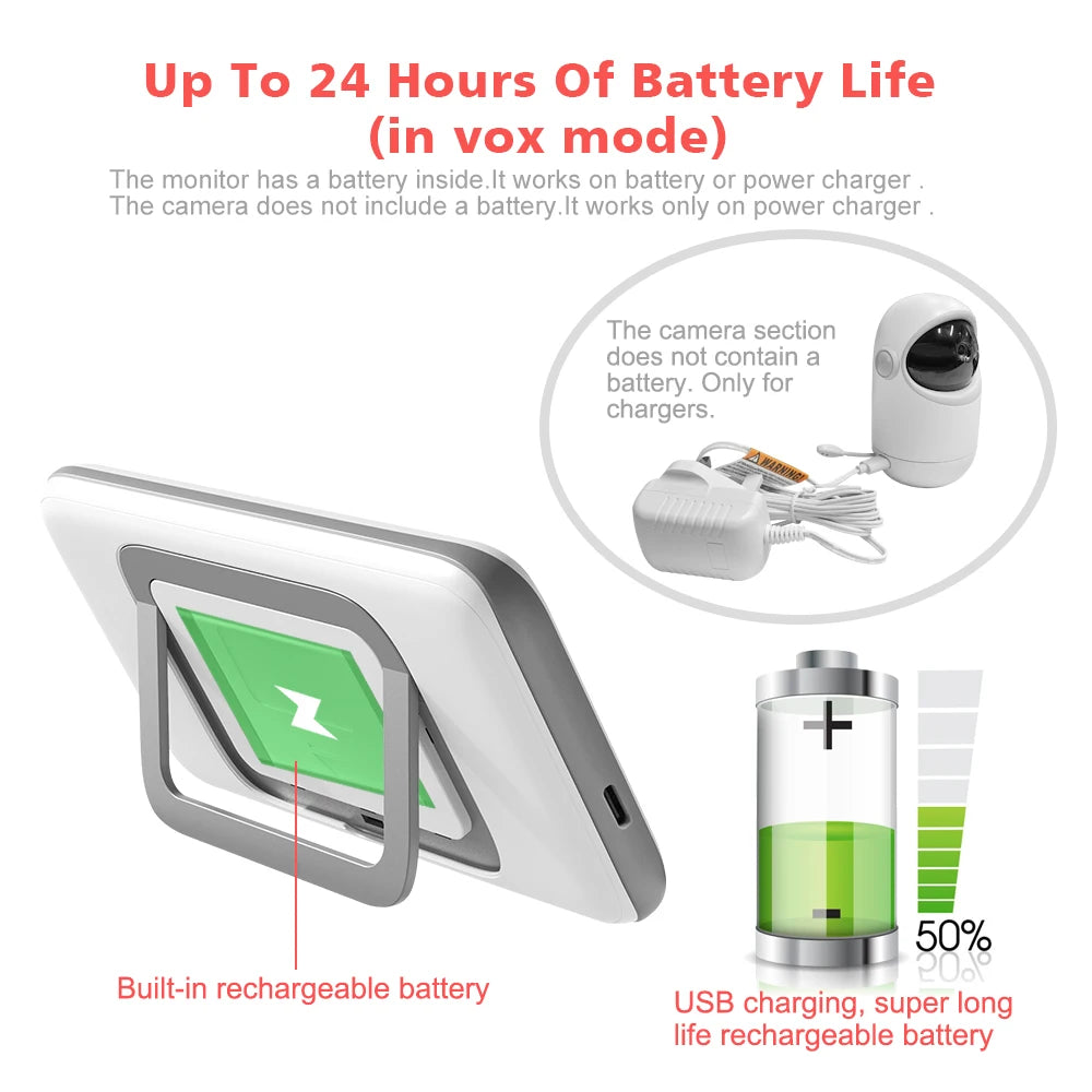 The monitor features a VOX function that puts the screen into energy-saving mode and automatically reactivates it as soon as sound is detected. With a range of up to 50 m indoors and 260 m outdoors, the device offers ample flexibility for monitoring the baby remotely.