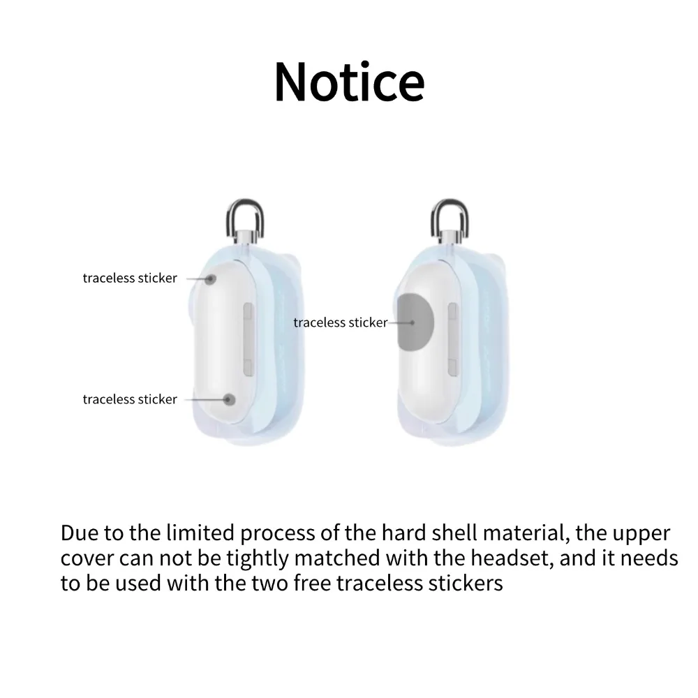 Aufgrund des speziellen Herstellungsprozesses der Hartschale ist die obere Abdeckung nicht direkt am Headset befestigbar. Daher werden zwei spurlos haftende Aufkleber mitgeliefert, um die Hülle sicher zu fixieren. Das Material besteht aus hochwertigem, flexiblem Silikon, das die AirPods zuverlässig vor Kratzern, Stößen und alltäglichen Beschädigungen schützt. Die Hülle ist leicht, kompakt und ideal für unterwegs.