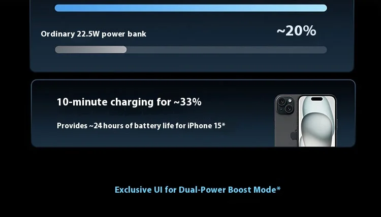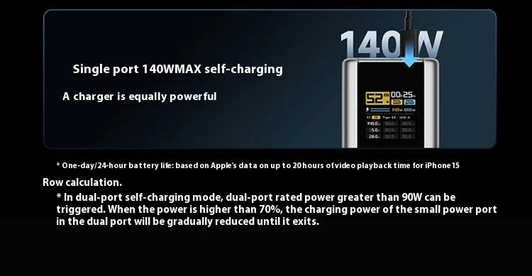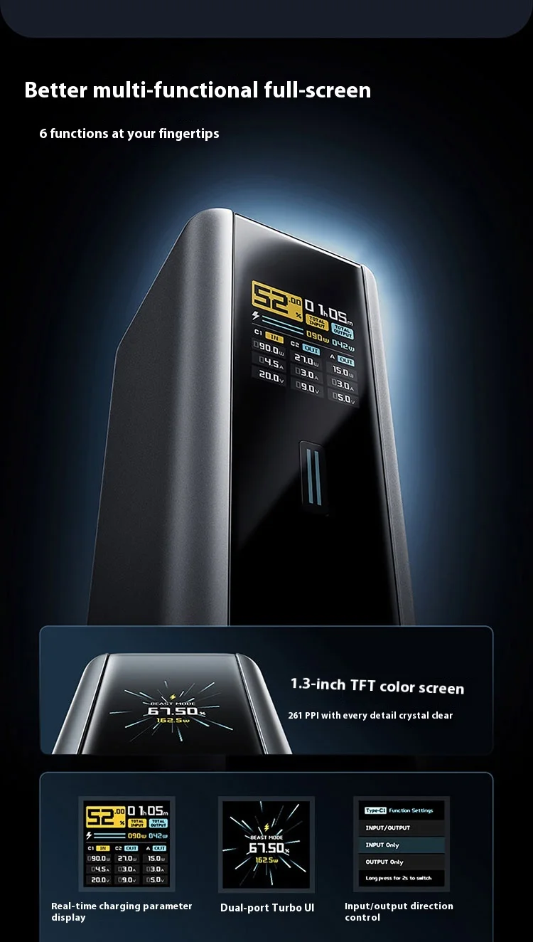 Mit Unterstützung für mehrere Schnellladeprotokolle wie PD, PPS, QC, SCP, AFC, FCP und UFCS sorgt sie für ultraschnelles Laden verschiedenster Geräte – egal ob Android, iPhone, Tablets oder Notebooks. Das integrierte digitale Display zeigt jederzeit die verbleibende Energie und Ladegeschwindigkeit an, sodass du volle Kontrolle über den Ladezustand hast.