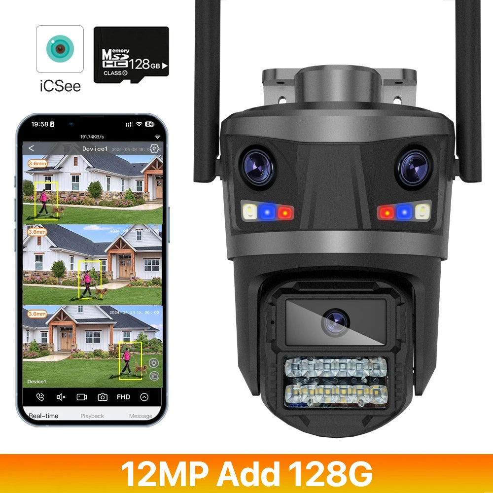 Diese hochwertige Drei-Linsen Außenkamera mit WLAN-Funktion bietet eine beeindruckende Auflösung von 12 Megapixeln und sorgt für eine umfassende Überwachung rund um Ihr Zuhause oder Geschäft. Dank des innovativen Drei-Bildschirm-Designs ermöglicht sie eine gleichzeitige Echtzeitüberwachung aus drei verschiedenen Blickwinkeln – völlig ohne tote Winkel und mit maximaler Detailtiefe.