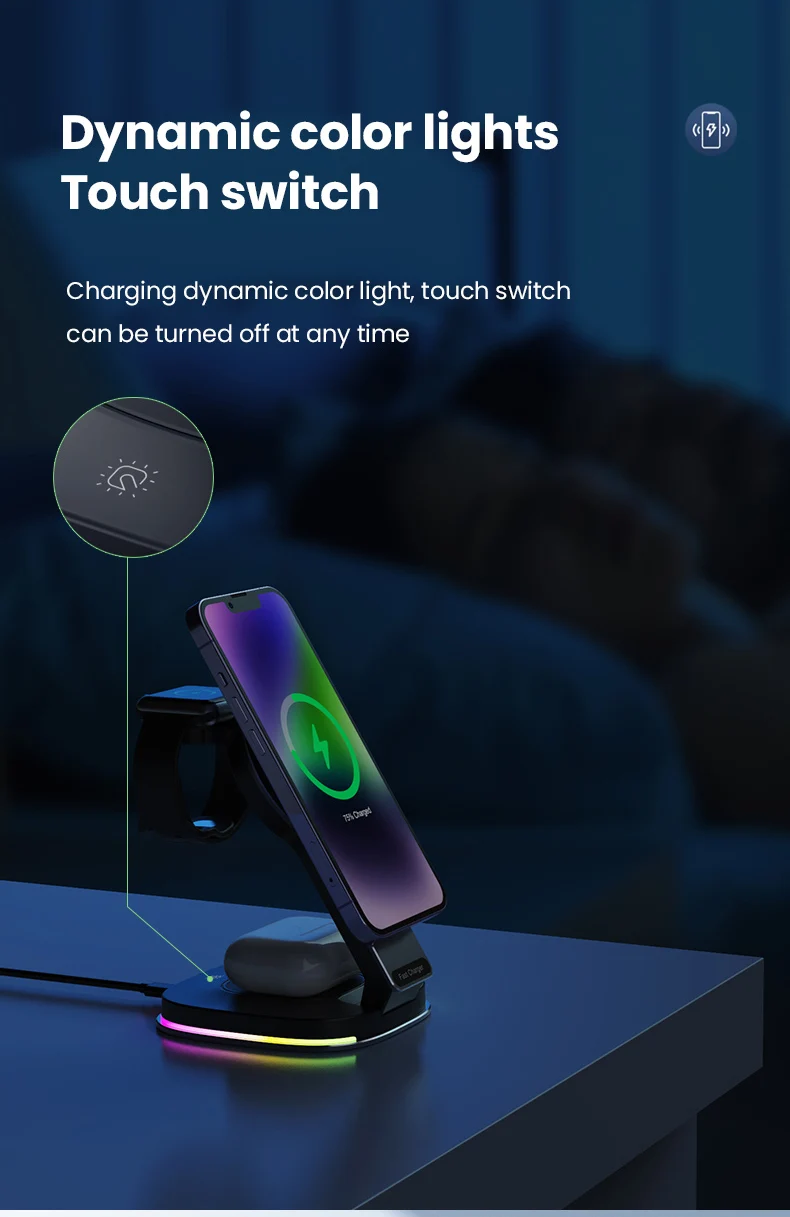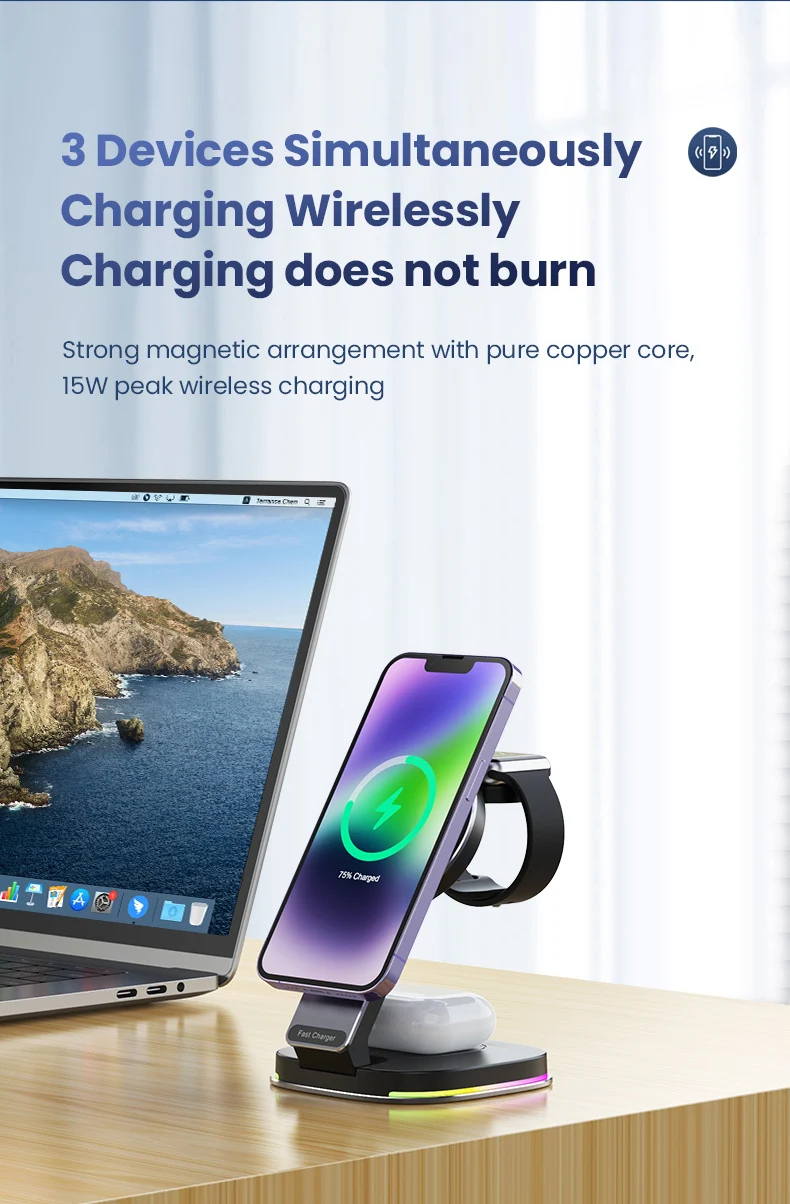 Der Charger ist mit einem Typ-C-Anschluss ausgestattet, der eine schnelle und stabile Energiezufuhr garantiert. Er unterstützt verschiedene Apple Geräte, einschließlich Smartphones, Smartwatches und kabellosen Ohrhörern, was ihn zu einer praktischen und multifunktionalen Lösung für Nutzer macht, die mehrere Geräte gleichzeitig laden möchten.