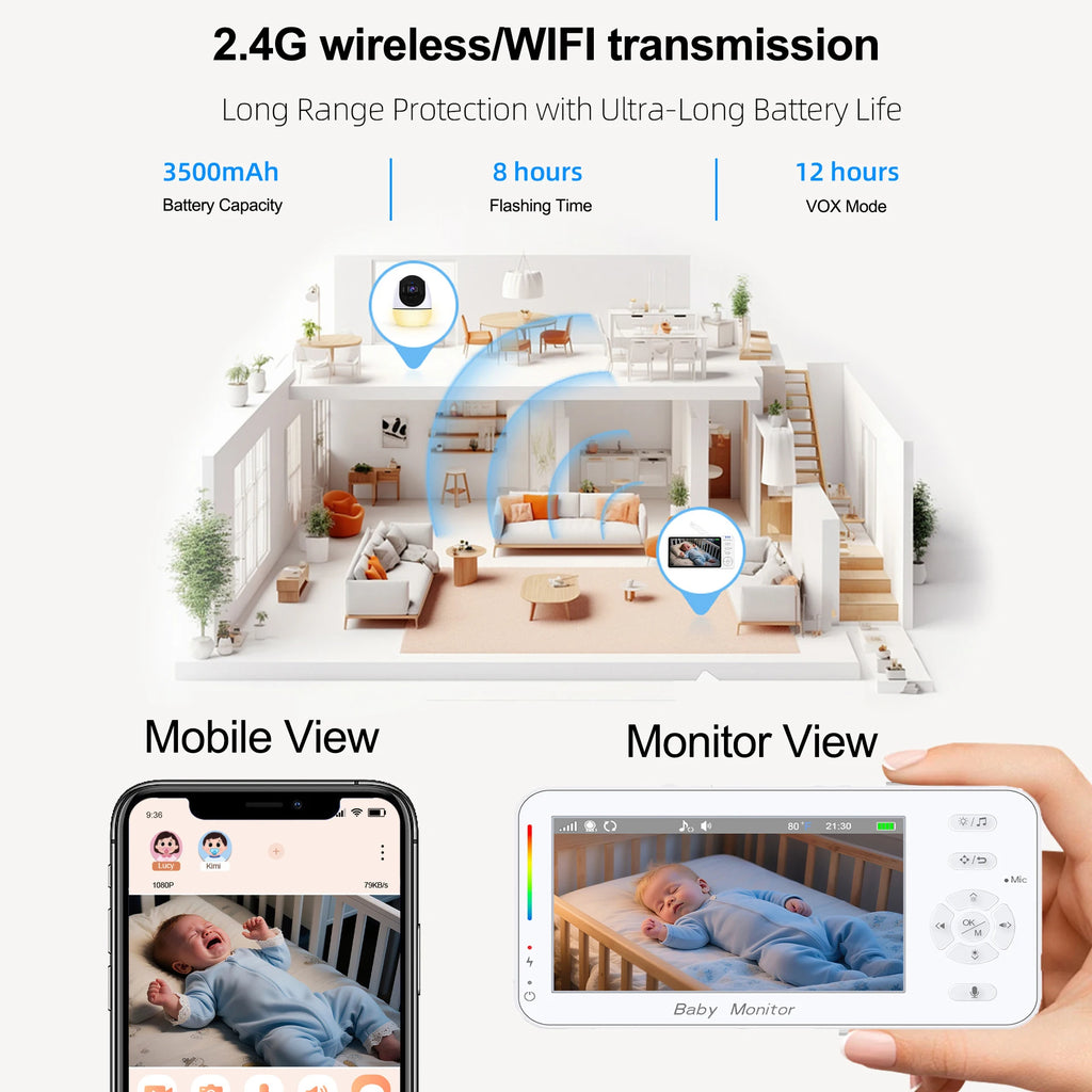 Die Dual-Steuerung über App und drahtlosen Monitor ermöglicht sowohl die Fernüberwachung als auch die direkte Kontrolle vor Ort. Mit Zwei-Wege-Audio können Eltern jederzeit mit ihrem Baby sprechen, um es zu beruhigen oder zu unterhalten. Die Kamera verfügt über automatische Infrarot-Nachtsicht, sodass auch in völliger Dunkelheit klare Schwarzweißbilder auf dem Monitor angezeigt werden.