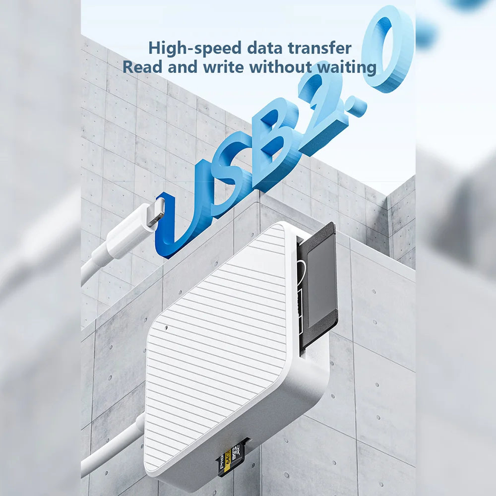 Dank des kompakten Designs lässt sich der Kartenleser leicht transportieren und ist ideal für unterwegs. Alle Kartenfächer sind in einem Gerät vereint, sodass Sie Fotos, Videos und andere Dateien direkt von Ihren Speicherkarten auf Ihr Gerät übertragen können, ohne zusätzliche Software oder Stromversorgung zu benötigen.
