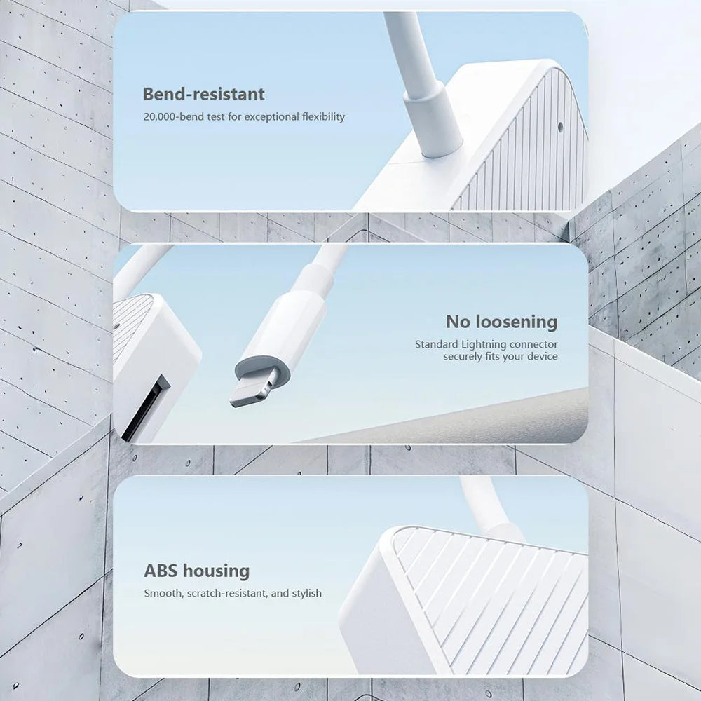 Der 4-in-1 Kartenleser Adapter ist die ideale Lösung für die schnelle Datenübertragung zwischen SD-, TF-, SM- und XD-Karten auf Smartphones, Tablets und Computern. Mit seiner Typ-C- und Lightning-Schnittstelle unterstützt er Android- und iOS-Geräte sowie Laptops mit USB-C-Anschluss.