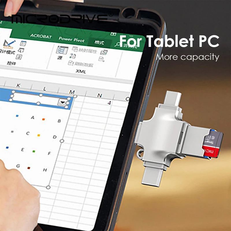 Der 4-in-1 USB Stick und Kartenleser ist ein vielseitiges Speichergerät für iPhone, iPad, Android-Smartphones und Tablets. Er unterstützt Micro SD Karten und ermöglicht das einfache Übertragen von Fotos, Videos, Musik und anderen Dateien zwischen Geräten. Dank der OTG-Funktion kann der Adapter direkt an Smartphones und Tablets angeschlossen werden, ohne dass zusätzliche Kabel oder Software erforderlich sind.