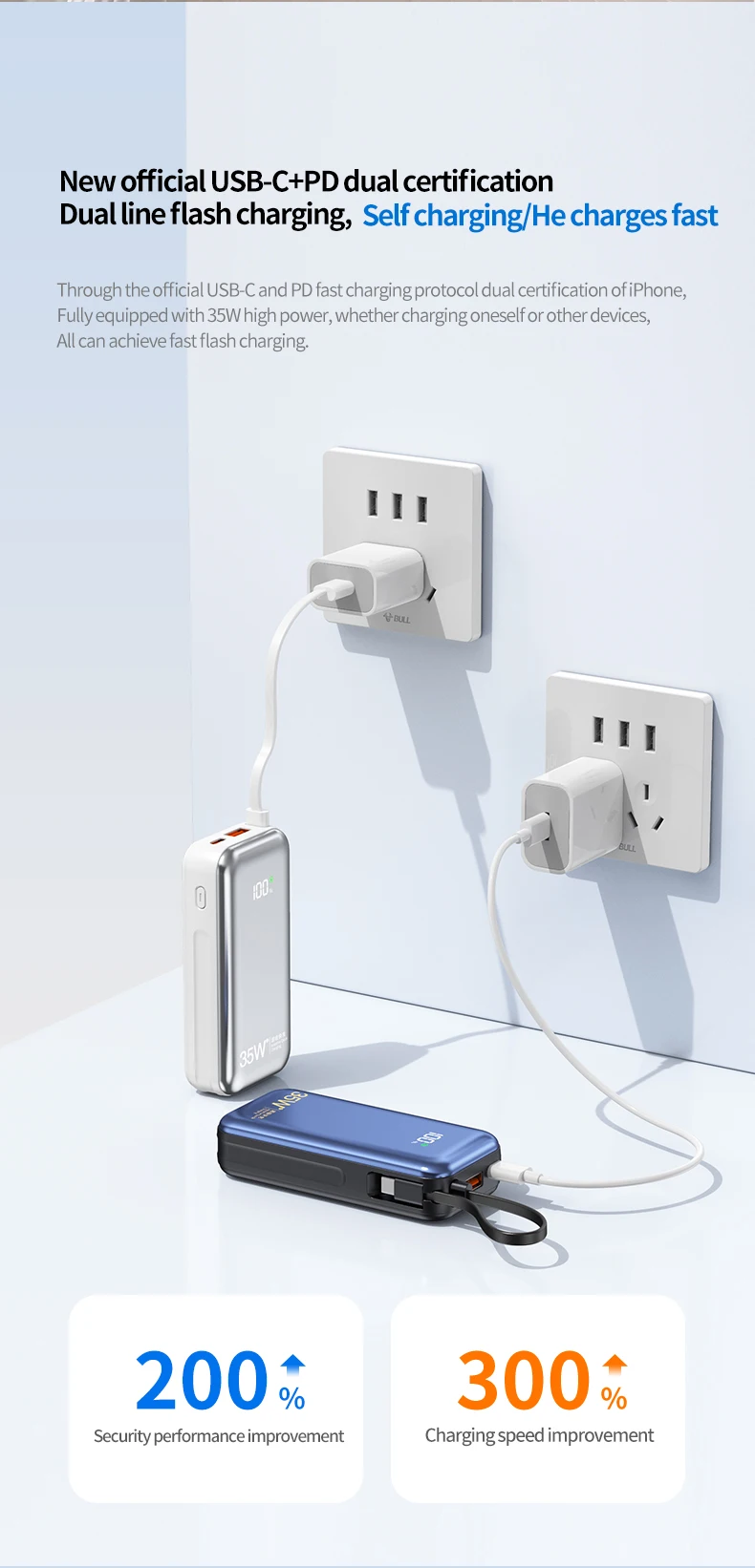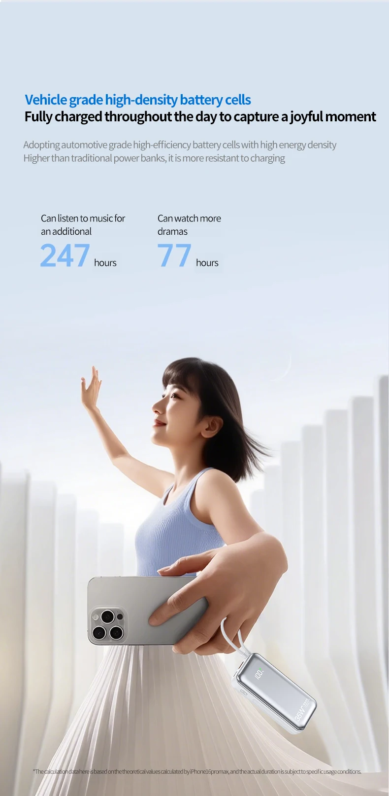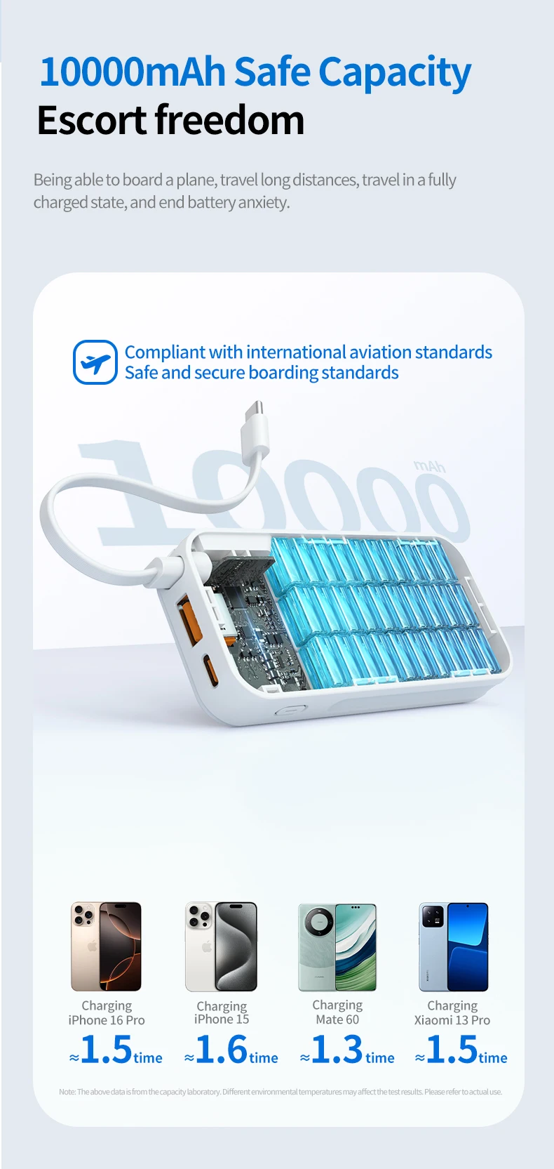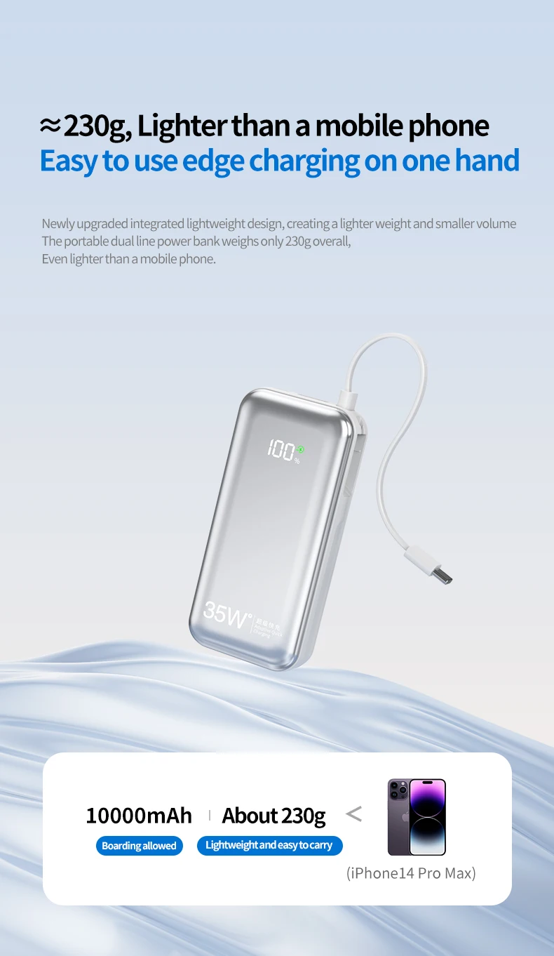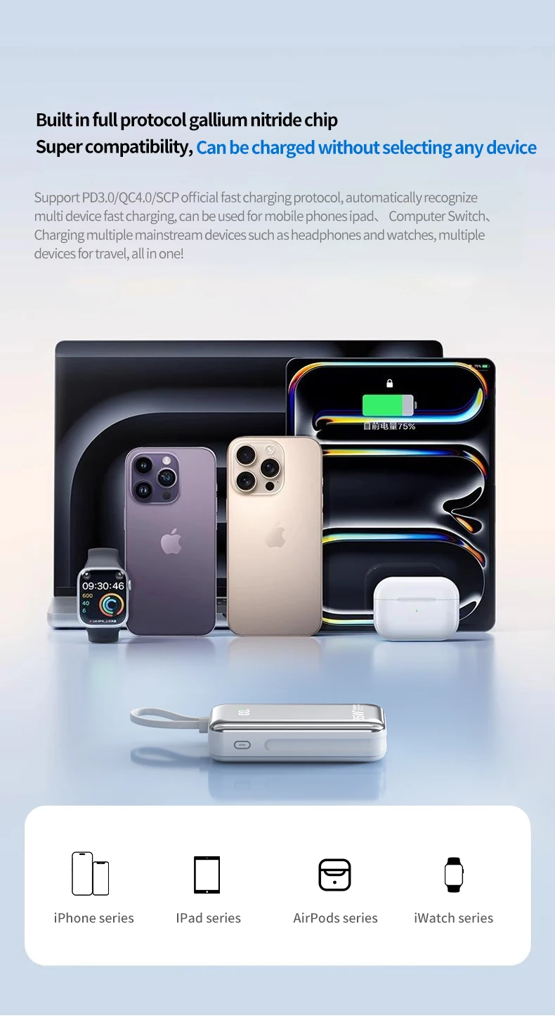 Diese tragbare Powerbank bietet eine leistungsstarke Kapazität von 20000mAh und unterstützt eine maximale Ausgangsleistung von 65W, ideal zum schnellen Laden von Smartphones, Tablets und Laptops. Ausgestattet mit eingebauten Kabeln und einem digitalen Display, zeigt sie den aktuellen Ladezustand klar und präzise an.