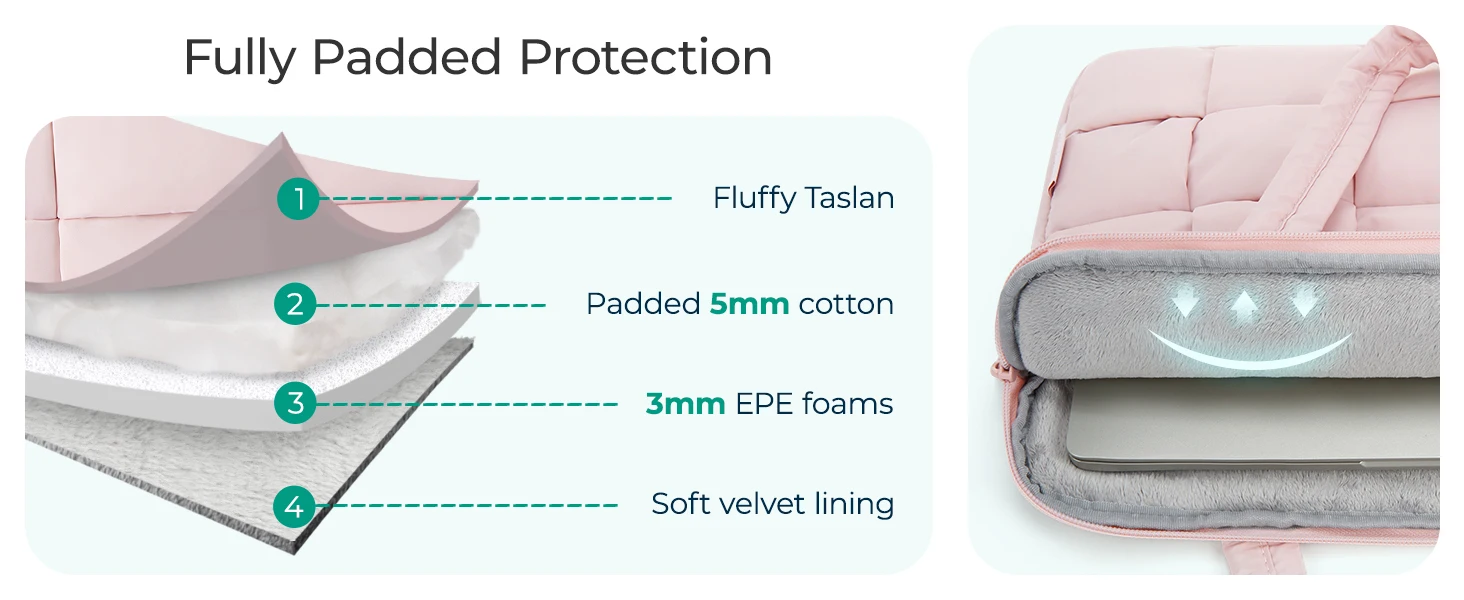 Der ultimative Schutz Ihres Geräts steht im Fokus: Die Außenseite besteht aus wasserabweisendem Material, das Spritzwasser und leichten Regen zuverlässig abhält. Im Inneren sorgt eine vierlagige Schutzstruktur mit Schaumstoff und Schwamm für eine stoßdämpfende Polsterung, die Ihren Laptop bei Stürzen und Kratzern schützt. Ein Diebstahlschutz-Doppelreißverschluss erhöht die Sicherheit zusätzlich.