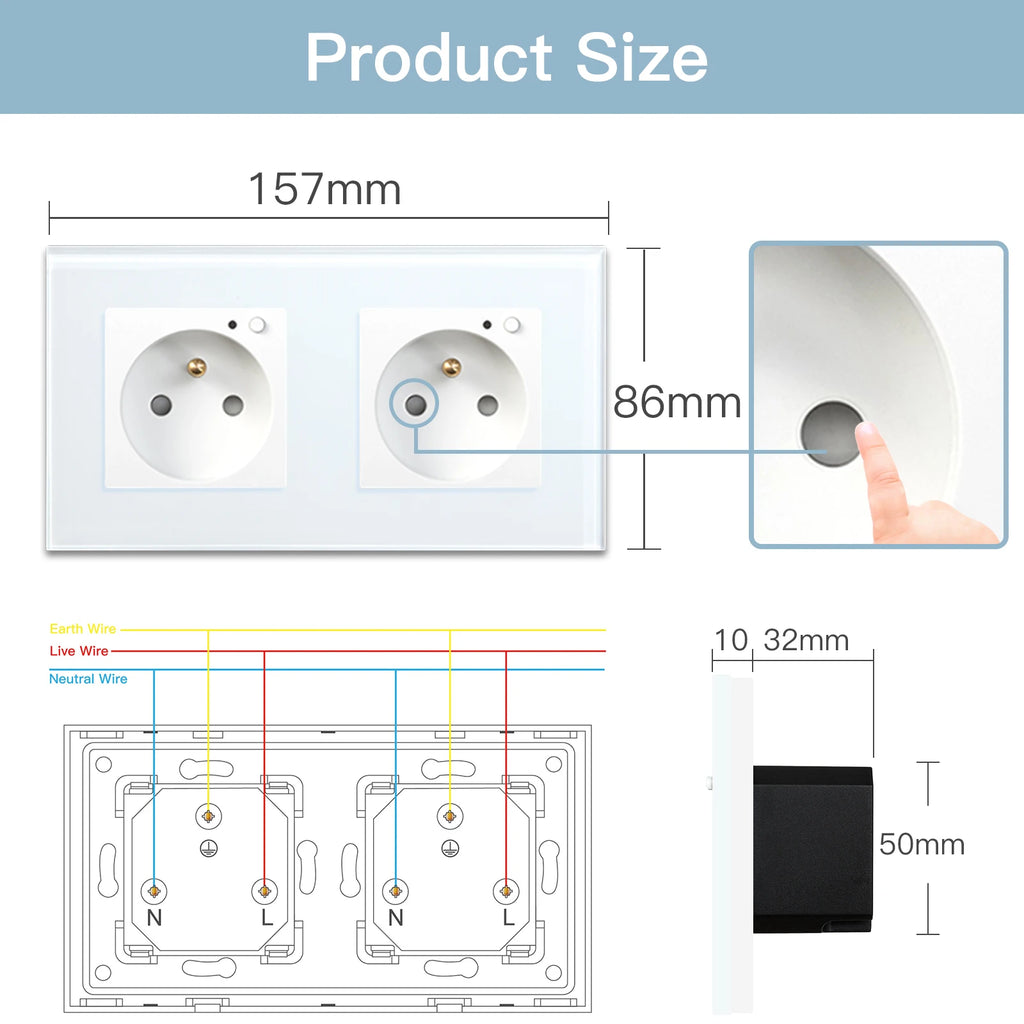 Diese moderne doppelte Wandsteckdose kombiniert elegantes Design mit praktischer Funktionalität für ein komfortables Zuhause. Sie verfügt über zwei Steckplätze mit EU-Buchsen, die bis zu 16A unterstützen, und ist in den Farben Weiß, Schwarz, Grau und Gold erhältlich. Das gehärtete Glaspanel sorgt für ein stilvolles, kratzfestes Finish und ist leicht zu reinigen.