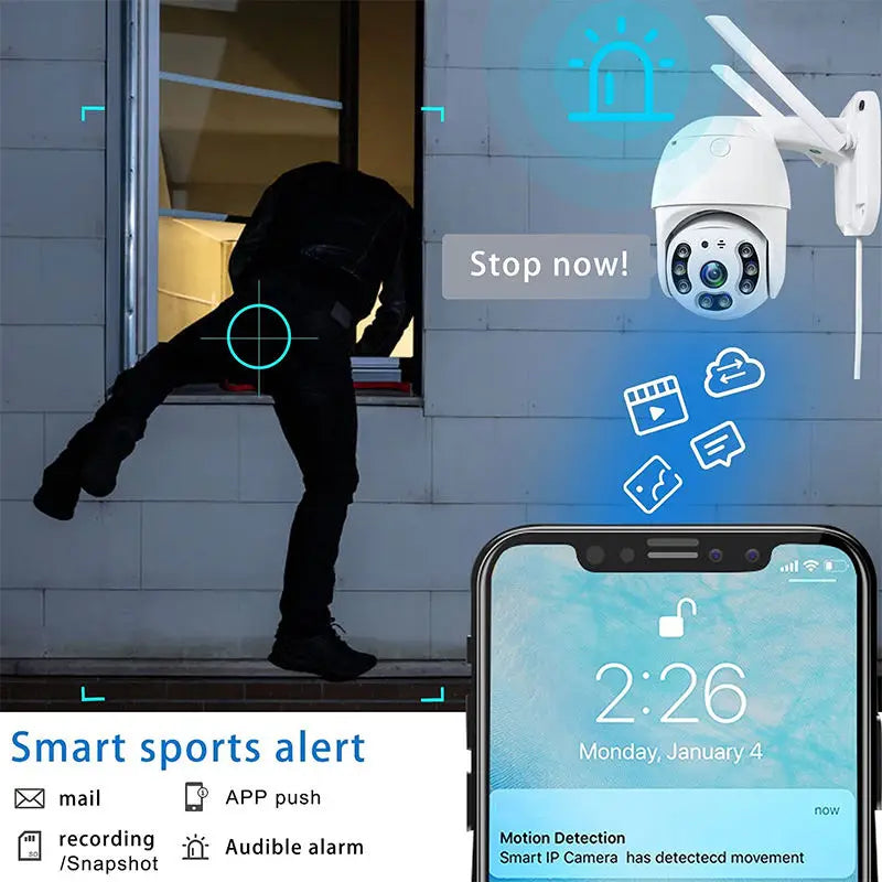 Diese drahtlose IP‑Kamera mit PT‑Funktion kombiniert moderne Technik mit robuster Bauweise und eignet sich ideal für den Innen‑ und Außenbereich. Sie bietet eine hohe Auflösung (wahlweise 1080P, 3MP, 5MP oder 8MP), um selbst feine Details klar darzustellen. Durch die Bewegungserkennung mit KI‑Humanoiderkennung werden Menschen zuverlässig erkannt und Fehlalarme minimiert.