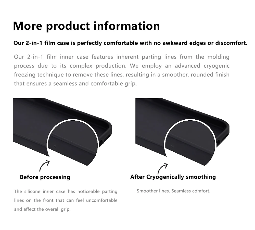 Die glänzende, doppellagige Rückseite aus PC (Polycarbonat) und TPU (Thermoplastisches Polyurethan) bietet optimalen Schutz vor Stößen, Kratzern, Staub und dem alltäglichen Verschleiß. Dank der weichen, rutschfesten Oberfläche liegt die Hülle angenehm in der Hand und verhindert ein versehentliches Abrutschen. Trotz des robusten Designs bleibt der Zugriff auf alle Anschlüsse, Tasten und die Kamera problemlos möglich.