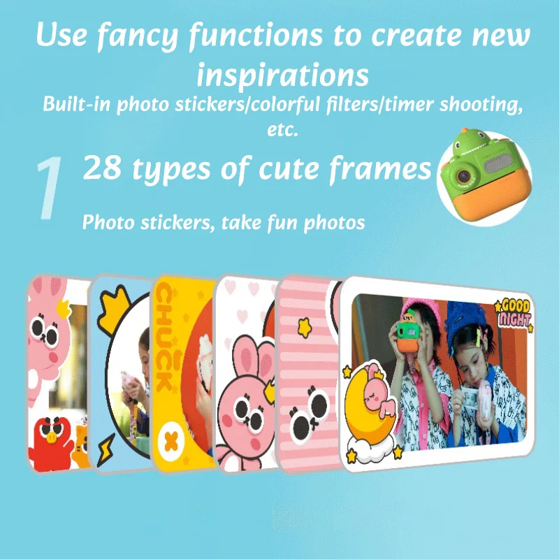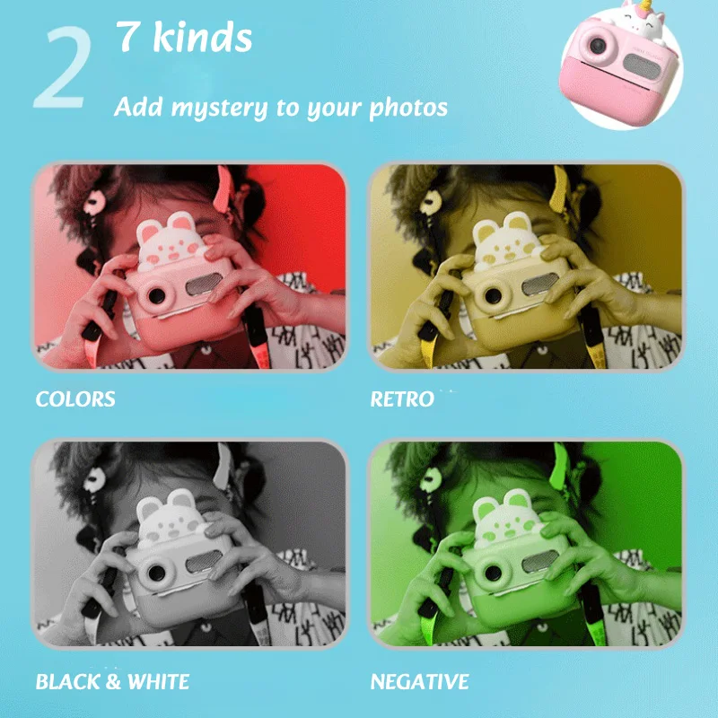 Diese Kinder-Druckkamera ist ein unterhaltsames und kreatives Spielzeug, das Fotografie, Drucken und Musik in einem Gerät vereint. Die Kamera eignet sich für Kinder im Alter von 4–12 Jahren und bietet einfache Bedienung, damit Kinder spielerisch Fotos aufnehmen und sofort ausdrucken können.