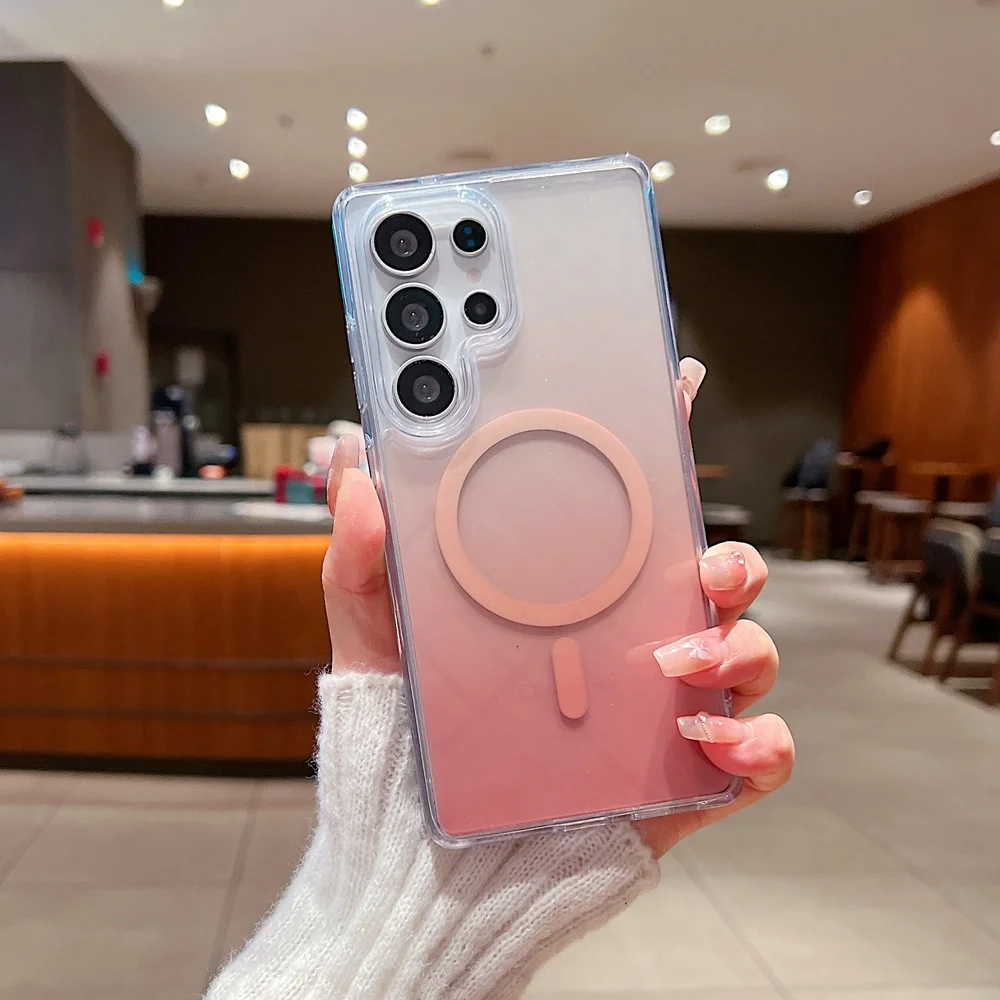 Diese luxuriöse Magsafe-Handyhülle mit transparentem Farbverlauf wurde speziell für Samsung Galaxy S24, S25 Ultra und Plus-Modelle entwickelt. Sie kombiniert stilvolles Design mit funktionaler Technologie und bietet dabei einen zuverlässigen Schutz für dein Gerät im Alltag.