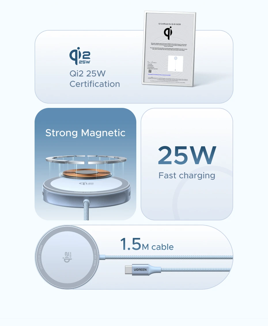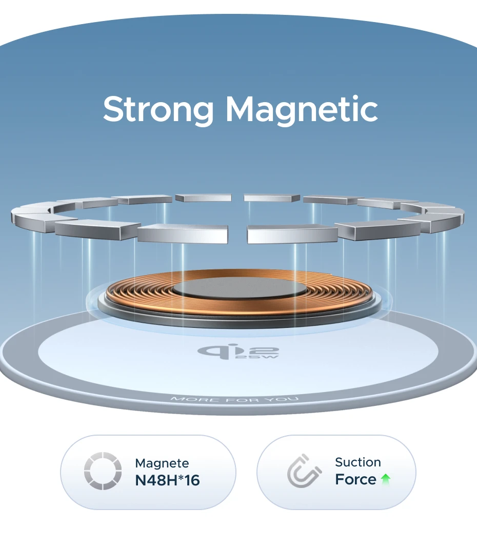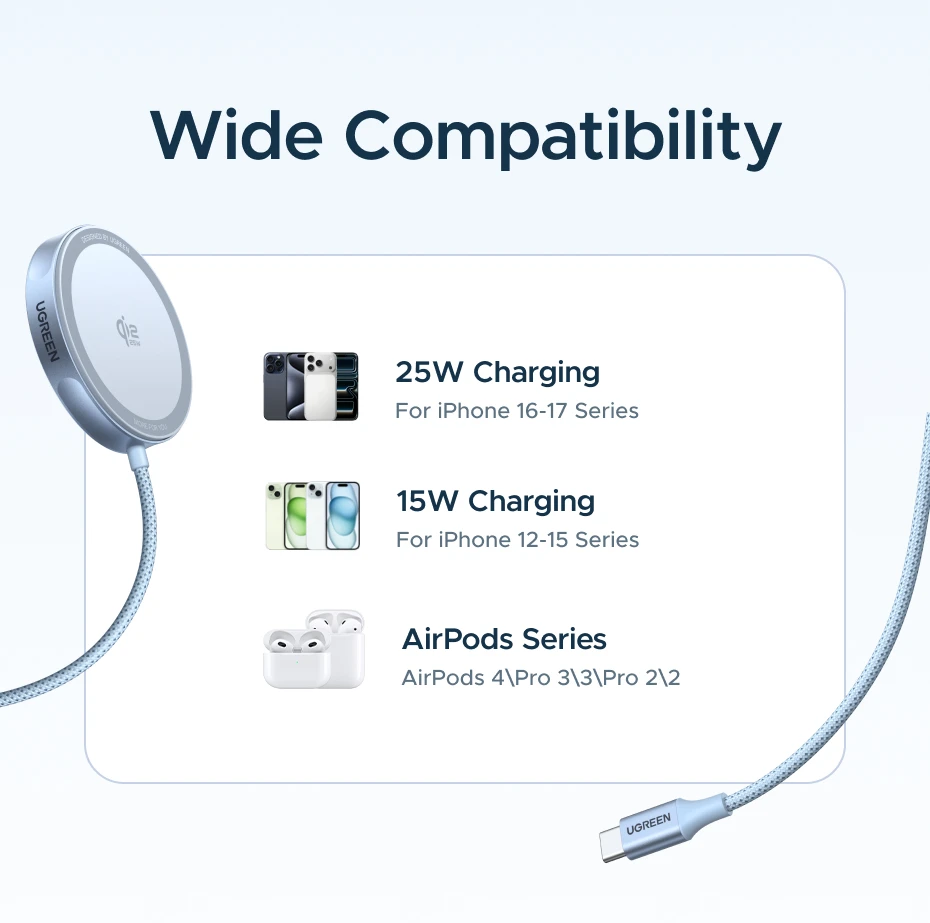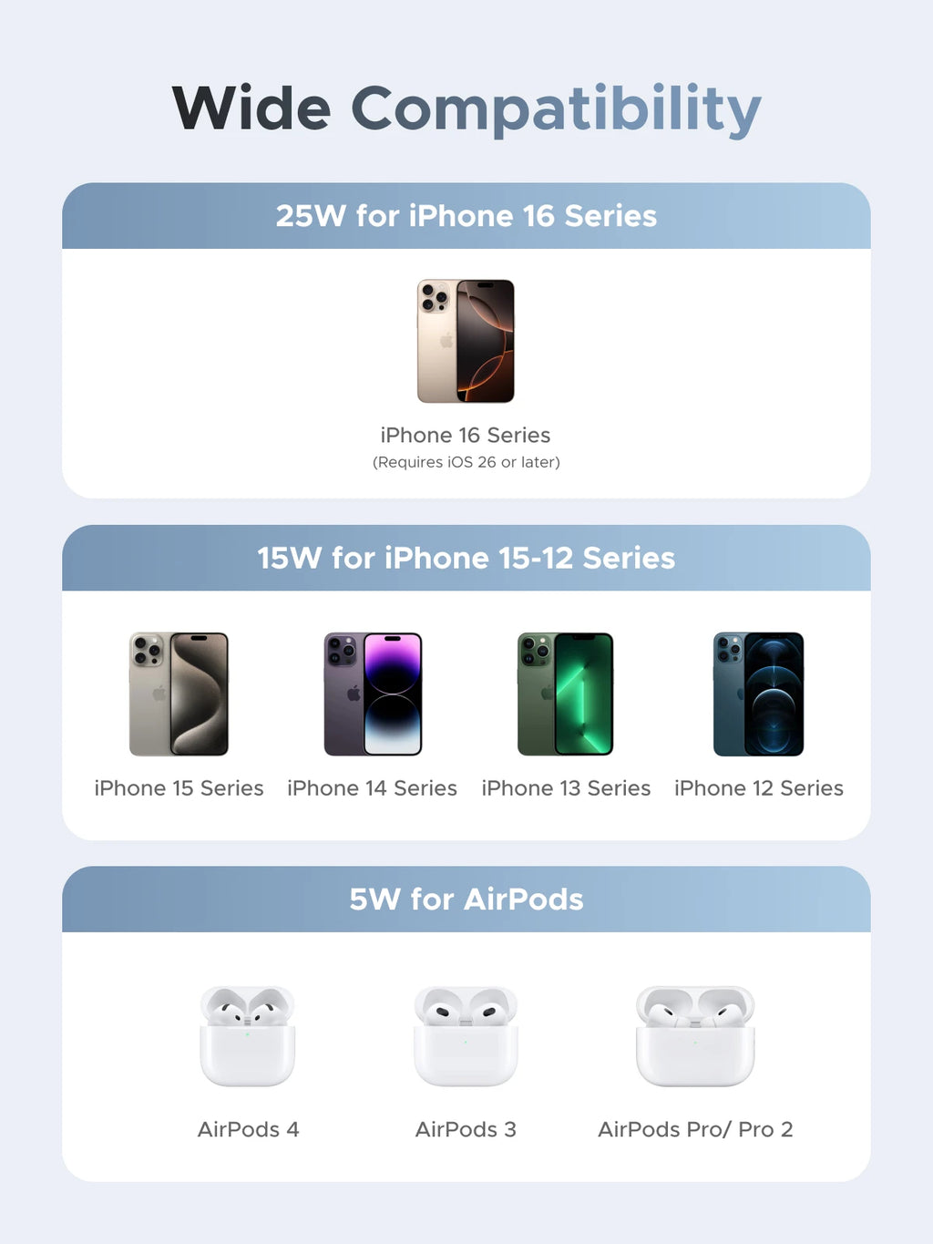 Dieses magnetische kabellose Ladegerät bietet eine schnelle und zuverlässige Ladelösung für iPhone 16 und 17 Pro Max Modelle sowie kompatible Kopfhörer. Dank der Qi2-Zertifizierung und der maximalen Ausgangsleistung von 15 W unterstützt es schnelles und sicheres kabelloses Laden, das die Akkuleistung Ihres Geräts optimal nutzt.
