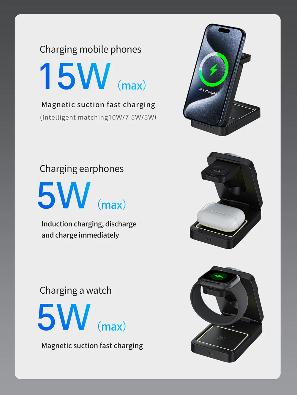 Das Ladegerät bietet vielseitige Nutzungsmöglichkeiten: Es kann vollständig zusammengeklappt für platzsparenden Transport genutzt werden, teilweise geöffnet als Handyhalter oder komplett entfaltet, um Telefon, Uhr und Kopfhörer gleichzeitig zu laden. Die maximale Ausgangsleistung beträgt 15 W für Smartphones und 5 W für Kopfhörer sowie Uhren. Die starke magnetische Saugkraft sorgt für sicheren Halt der Geräte während des Ladevorgangs.