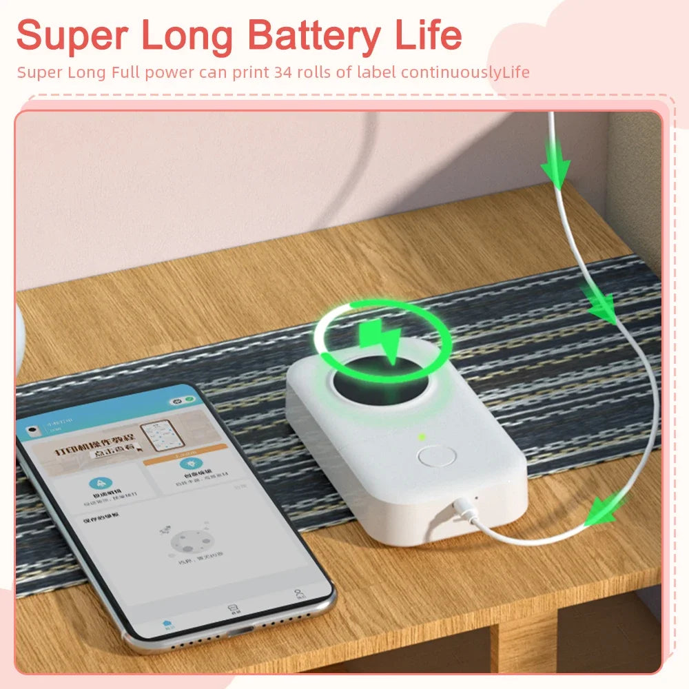Die Verbindung zum Smartphone erfolgt kabellos per Bluetooth 4.2, kompatibel mit iOS und Android. Nach dem Herstellen der Verbindung und Kalibrierung des Etiketts können Sie jederzeit und überall drucken. Um Energie zu sparen, schaltet sich das Gerät nach 15 Minuten Inaktivität automatisch aus.