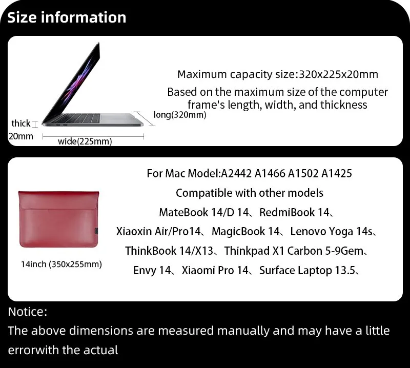 Bitte beachten Sie die Größenangaben: Die Hülle passt für ultradünne Laptops von 14 bis 14,2 Zoll, ist jedoch nicht für ältere oder dickere Gaming-Notebooks geeignet.