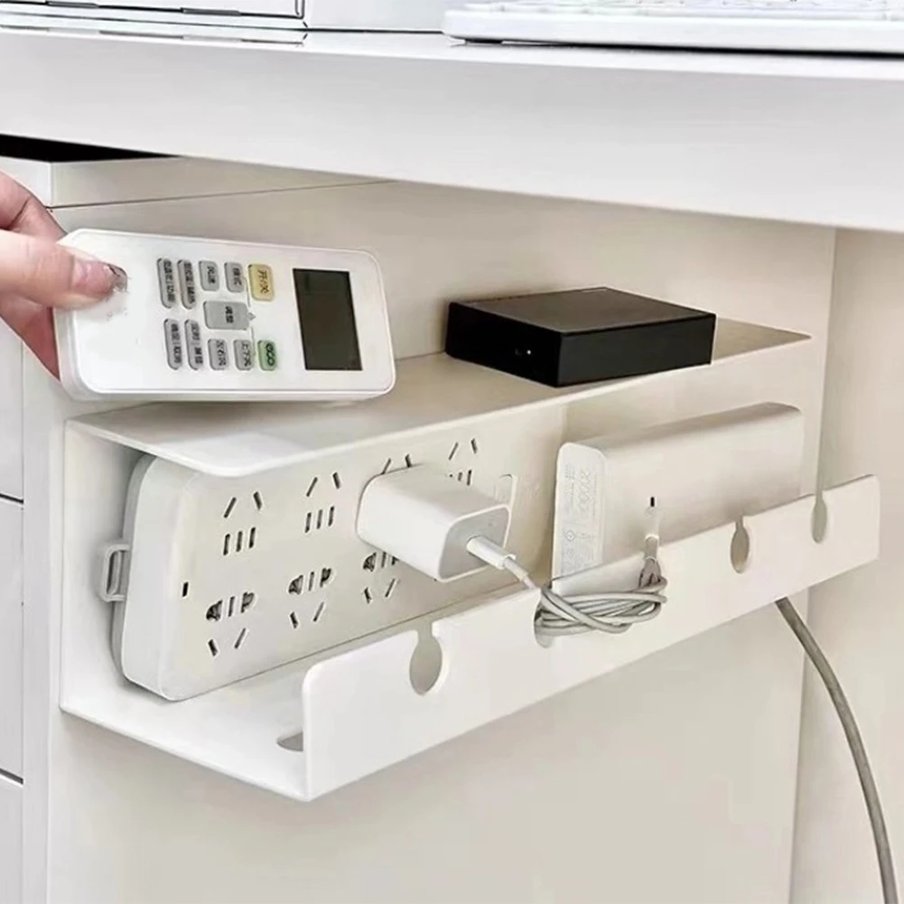 Die praktische Plug-Through-Basis erleichtert das Durchführen von Steckern, Adaptern oder Steckdosenleisten, wodurch der Zugriff auf Stromquellen bequem und effizient bleibt. Dieses Kabelregal unter dem Schreibtisch ist perfekt für Büro, Zuhause oder Homeoffice.
