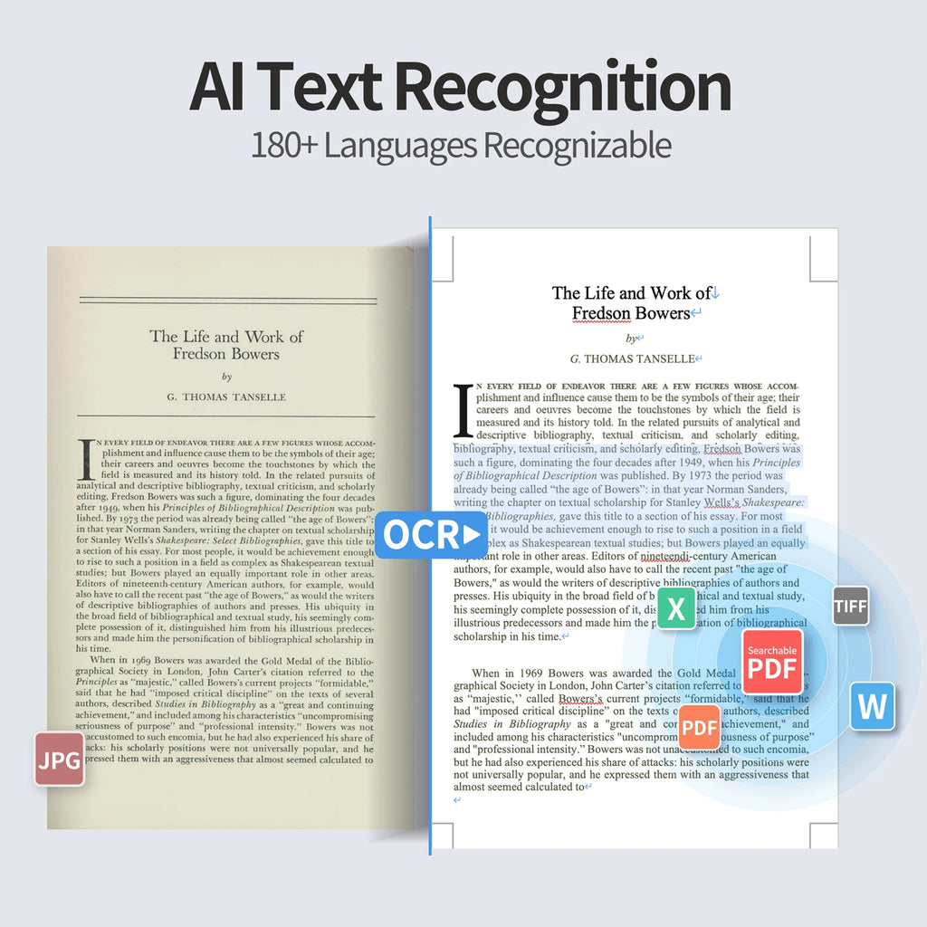 Der Scanner unterstützt über 180 OCR-Sprachen, sodass gescannte Dokumente direkt in durchsuchbare PDF-Dateien oder bearbeitbare Formate wie Word, Excel und TIFF umgewandelt werden können. Dies macht ihn perfekt für Heimbüros, Familien und kleine Unternehmen, die Papierdokumente digital archivieren möchten.