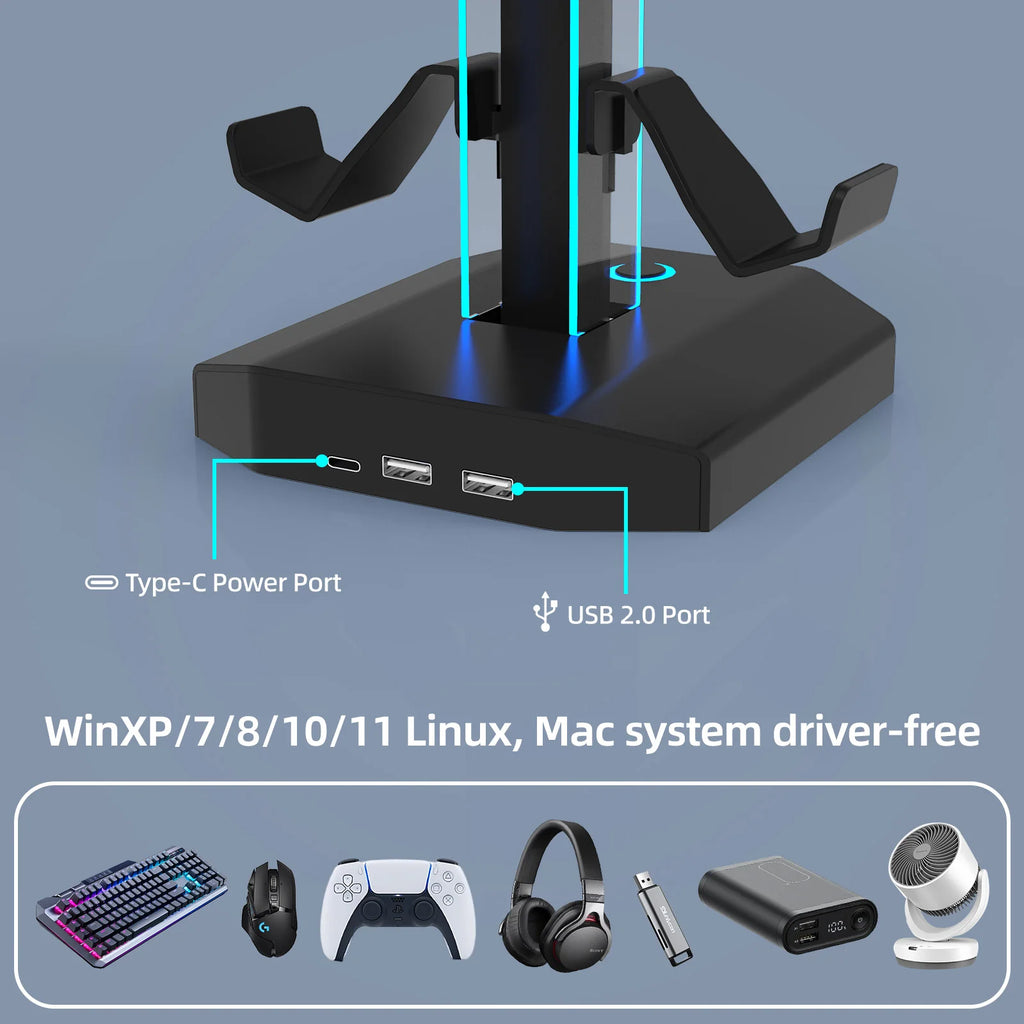 Das Design ist multifunktional: Der abnehmbare Controller-Haken und der drehbare Kopfhörerhalter ermöglichen die gleichzeitige Aufbewahrung von einem Headset und zwei Controllern oder bis zu vier Game-Controllern. Der Kopfhörerhalter ist 360° drehbar und mit USB- sowie Type-C-Anschlüssen ausgestattet, sodass eine einfache und flexible Verbindung möglich ist.