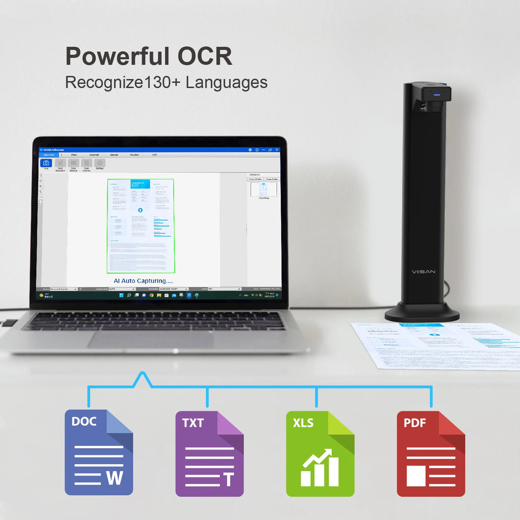 Ausgestattet mit einer leistungsstarken Scan-Software, die gewellte Seiten automatisch glättet, Fingerabdrücke entfernt, den Hintergrund reinigt und Dokumente automatisch in zwei Seiten aufteilt. Die Software ermöglicht zudem das Erfassen von Schnappschüssen, das Erkennen von Barcodes und das Speichern von Scans als JPEG-Dateien. Dank der integrierten OCR-Engine können gescannte Dokumente in durchsuchbare PDF-Dateien oder bearbeitbare Word-, Excel- und Textformate umgewandelt werden, was die digitale Weiterverarbeitung erheblich erleichtert.